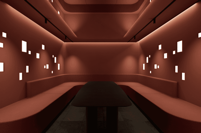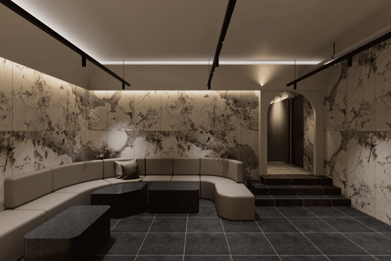 좌석이 배치된 벽면은 대리석 질감과 은은한 조명으로 아늑하고 세련된 분위기 연출