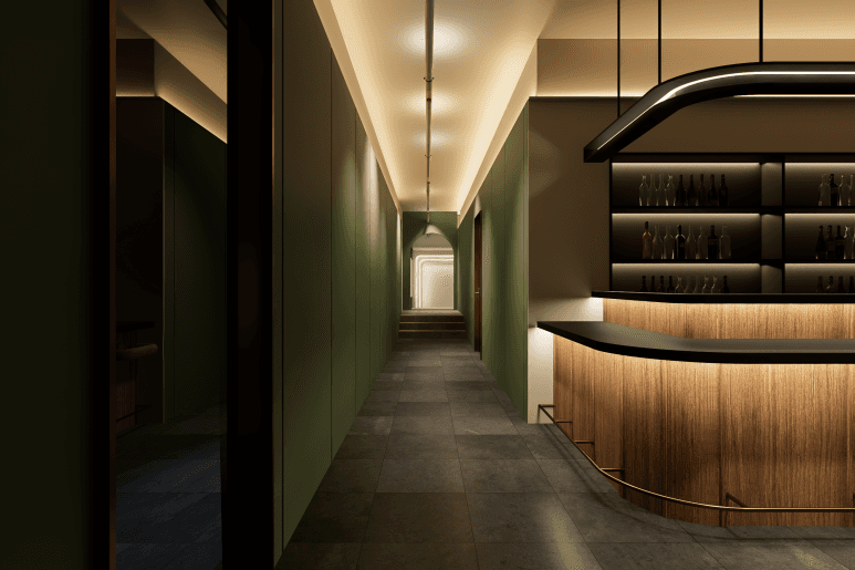 어두운 톤과 아치형 입구를 활용해 클래식하면서 기대감을 높이는 복도 디자인