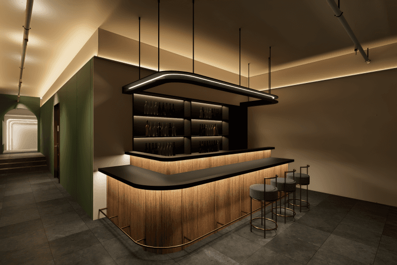 따뜻한 목재 마감 + 은은한 조명으로 아늑한 바 테이블 공간 연출
