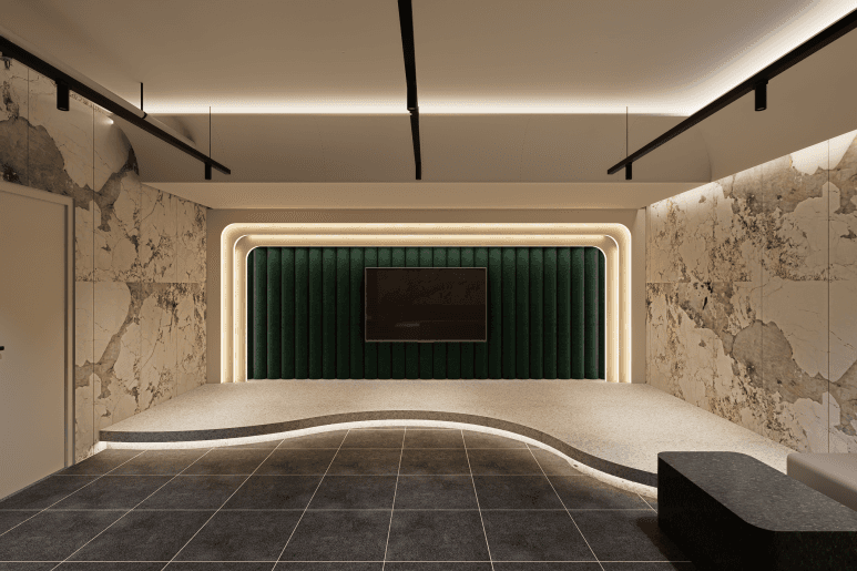 깊이감을 주는 초록색 패널 + 간접조명으로 고급스러움 강화