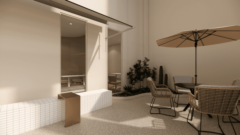 [ 테라스 공간 ]아늑하면서도 세련된 테라스 공간으로,라탄 소재의 의자와 큰 파라솔을 배치하였고,벽면에도 화이트톤 좌석을 놓았습니다.전체적으로 모던하고 자연 친화적인 분위기로휴식과 여유를 느낄 수 있는 공간으로 연출하였습니다.