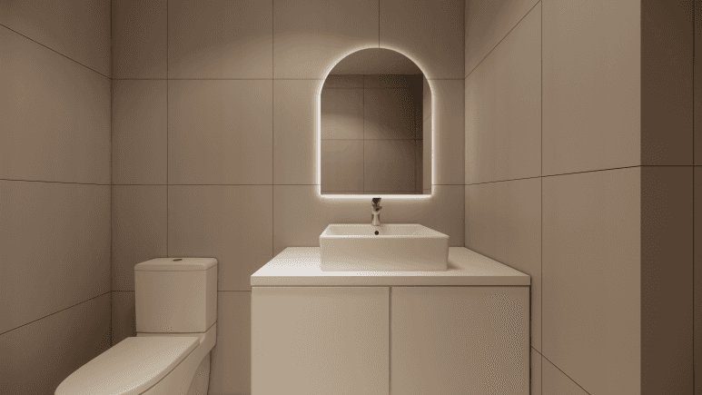[내부 좌석과 화장실]깔끔하고 미니멀한 디자인의 좌석 공간에,단체와 개인 모두를 위한 좌석으로 구성했습니다.화장실도 화이트와 베이지톤으로깔끔한 인상을 줍니다.